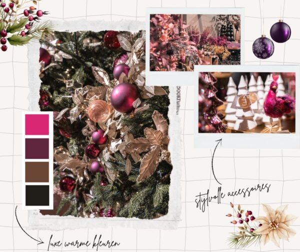 Maak kennis met de trendkleur van 2024: een palet van warme tinten zoals diep fuchsia, aubergine en gouden accenten! Deze kleuren geven je kerstdecoratie een chique, luxe uitstraling. Voeg warme kleuren zoals bruin, lila, en zelfs zwart toe voor een gedurfde en stijlvolle look.